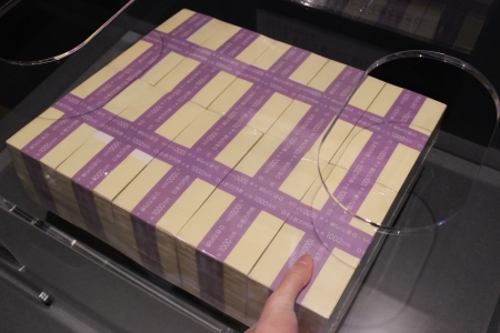 体験コーナー『大金を持ってみよう!』にて、一億円(フェイク)を持ってみた。約10kgあるらしい。片手じゃ無理・・・。